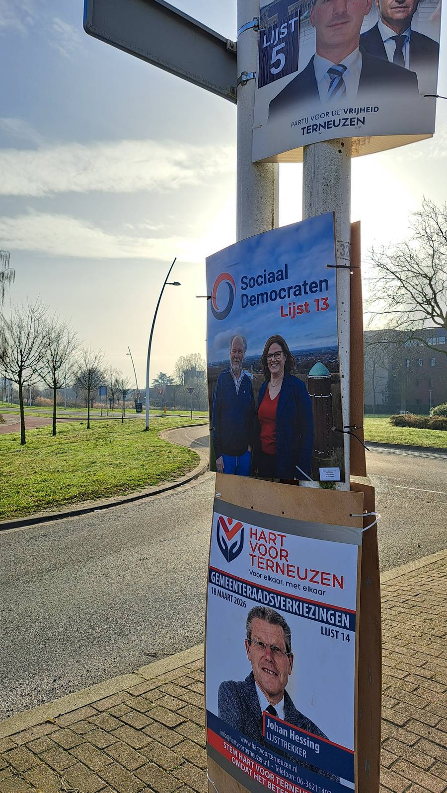De borden moeten minimaal vijftien meter van een straathoek staan.De borden mogen maximaal drie weken voor de verkiezingen worden neergezet. Een week na de gang naar de stembus moeten ze zijn verwijderd. Uiterlijk 25 maart dus.Elke partij mag maximaal tien borden in de stad Terneuzen plaatsen. In alle andere plaatsen in de gemeente mogen er maximaal vijf worden bevestigd.Op elk bord moet een contactpersoon staan met een telefoonnummer.Posters plakken? Dat mag, maar niet op openbare voorwerpen en locaties die vanaf een openbare plaats zichtbaar zijn. De gemeente plaatst geen zuilen meer waarop partijen zich met lijm en papier kunnen uitleven.